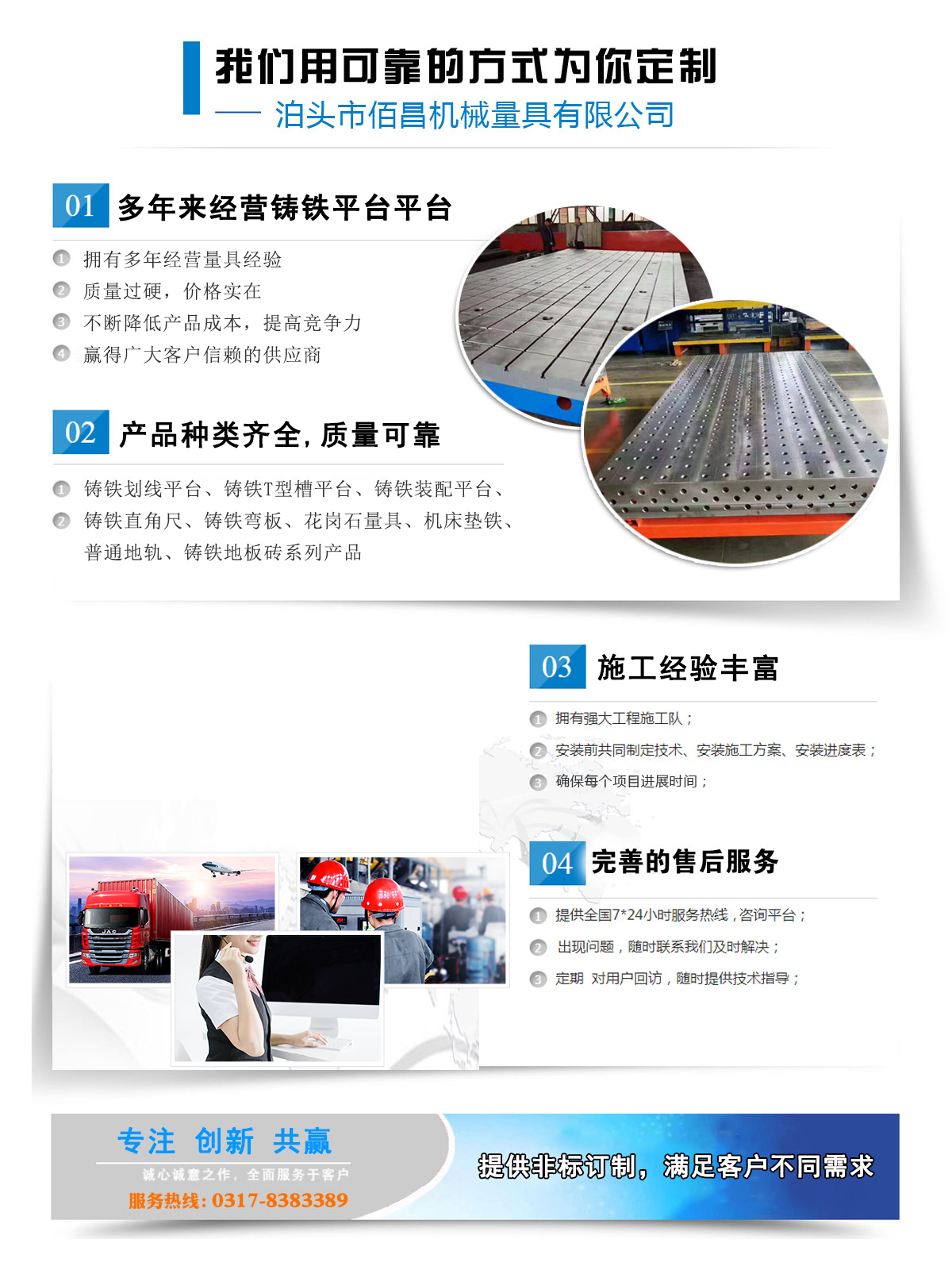 泊頭市佰昌機械量具有限公司坐落在有“鑄造之鄉”美稱的泊頭市,我公司自創建初期堅持誠信原則和不斷創新的原則,_為廣大用戶提供鑄鐵平板鑄鐵地板劃線平臺等放心產品,我們的產品_程度高,得到了廣大用戶的高度認可。